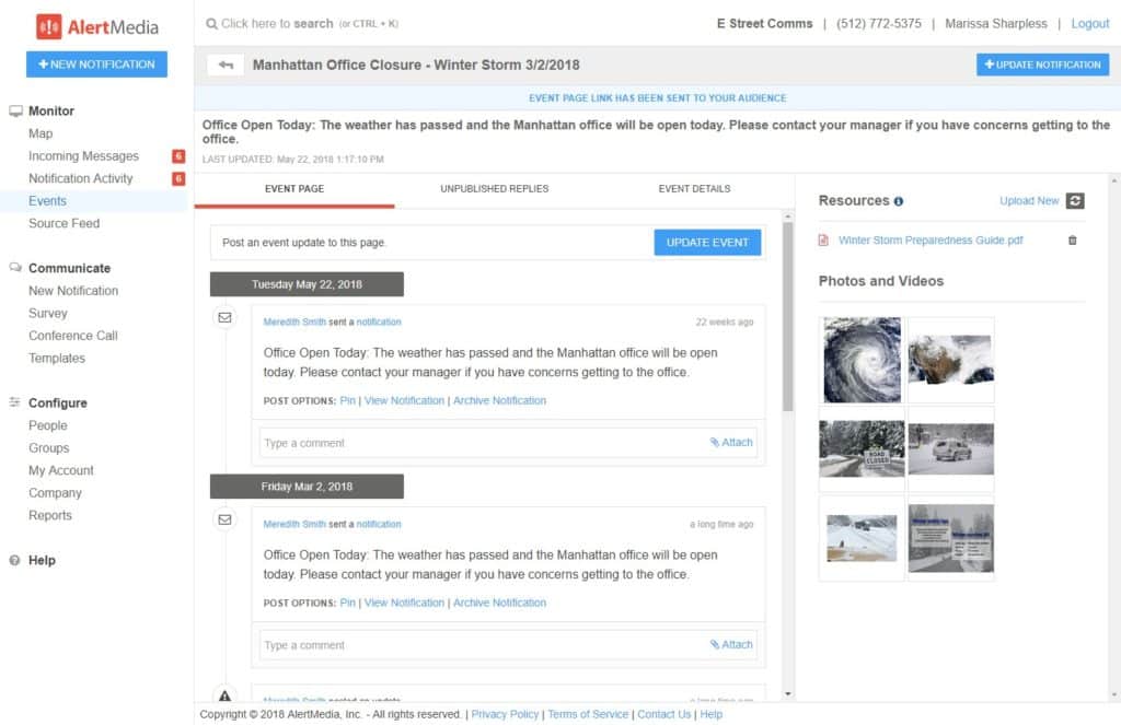An emergency communication system—with features such as multichannel delivery, two-way messaging, pre-built communication templates, and easily updatable event pages—can help you ensure all employees receive the information they need when they need it. Organizations can quickly and reliably disseminate information to employees about storm-related outages, closures, and safety information.